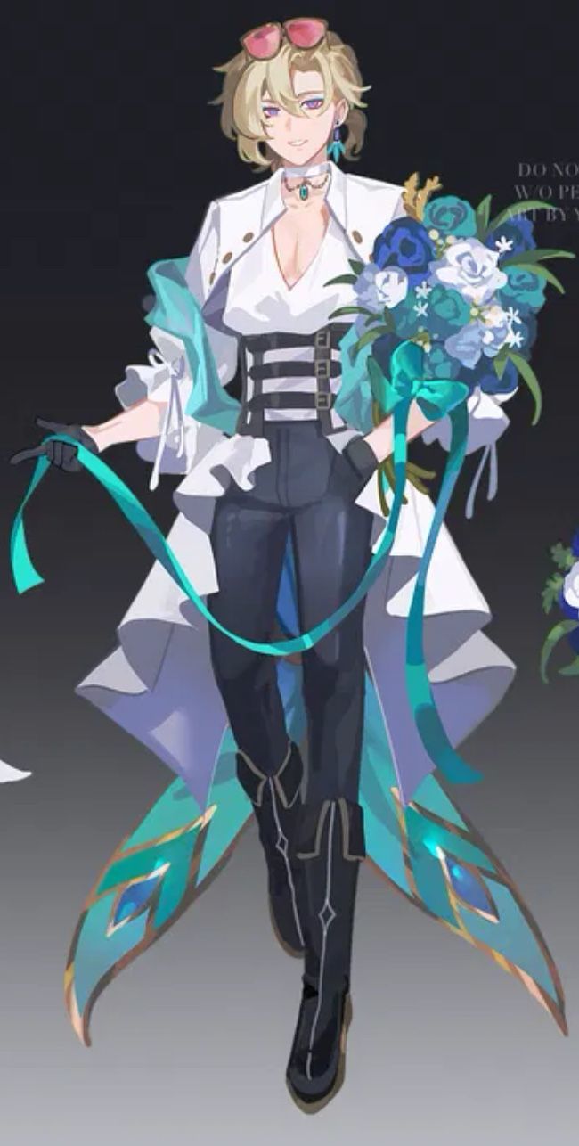 [ Aventurine dressed differently than he had been prior to stepping into this place lets the stranger do so without fuss, going right along with the scenario like they've known each other forever. his own mask is currently off, clipped to his shoulder like a shoulder adornment. his expression is one that would usually be reserved for a friend, void of the formal distance and politeness of meeting sometime new, but very welcome in the feeling it gives off.