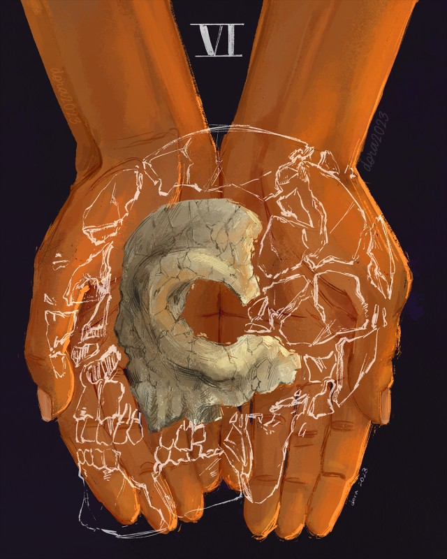 There's a moment where she glimpses the figures: entangled, interlaced. What looks like beauty and then abruptly reveals itself: the one with its head turned to look screams, reaches. It catches at something in her chest, echoes in Pyrrha's voice: don't do this. Just watch us, she'd said, nothing but confidence, and now, for the first time, alone, she feels the barest flicker of doubt.